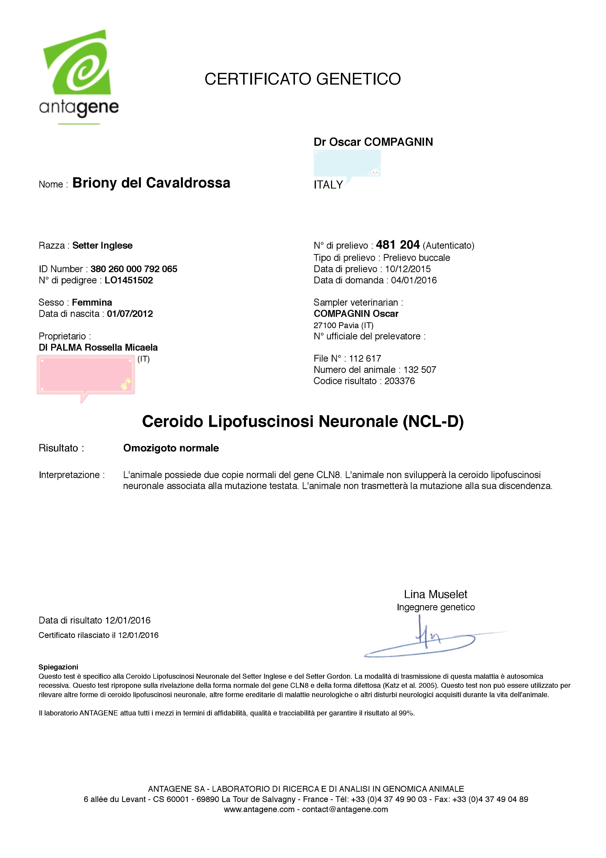 Verifiche sanitarie HD A ED 0 Esente PRA (rcd4) Esente NCL Dosaggio Taurina nella norma