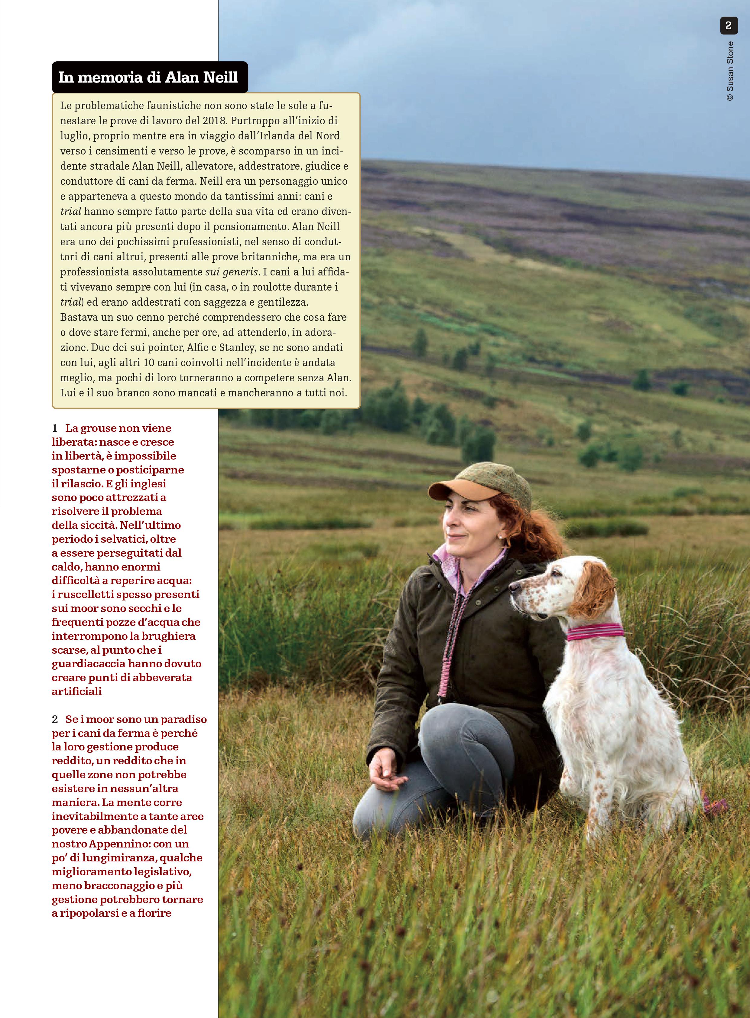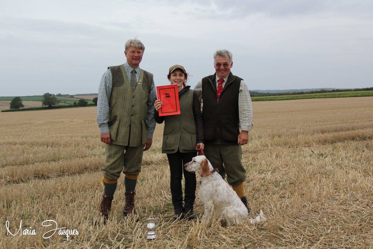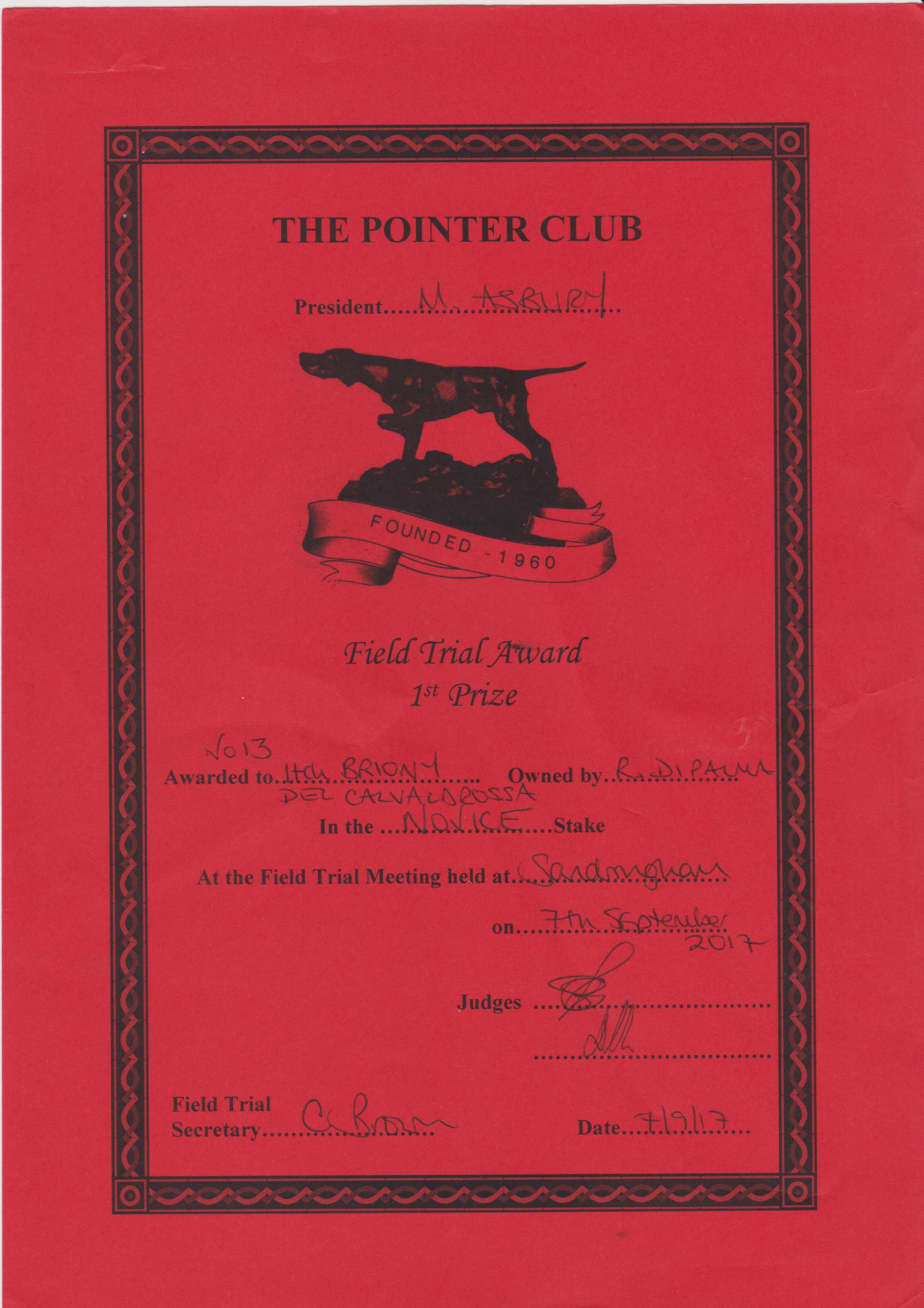Dopo aver avuto la conferma che fosse un buon cane da caccia, ho iniziato ad addestrarla e condurla personalmente in prove di lavoro ENCI e, mia principale passione, in prove organizzate dal Kennel Club inglese (su grouse e su starne). Nel 2017, ha vinto la Novice Stake su starne organizzata dal Pointer Club a Sandrigham (Inghilterra). Con questo risultato, ha avuto accesso allo Stud Book del Kennel Club e diritto perpetuo di accedere al Crufts in classe Field Trials. Briony è il primo cane italiano (e continentale) a vincere una prova di lavoro su starne nel Regno Unito.