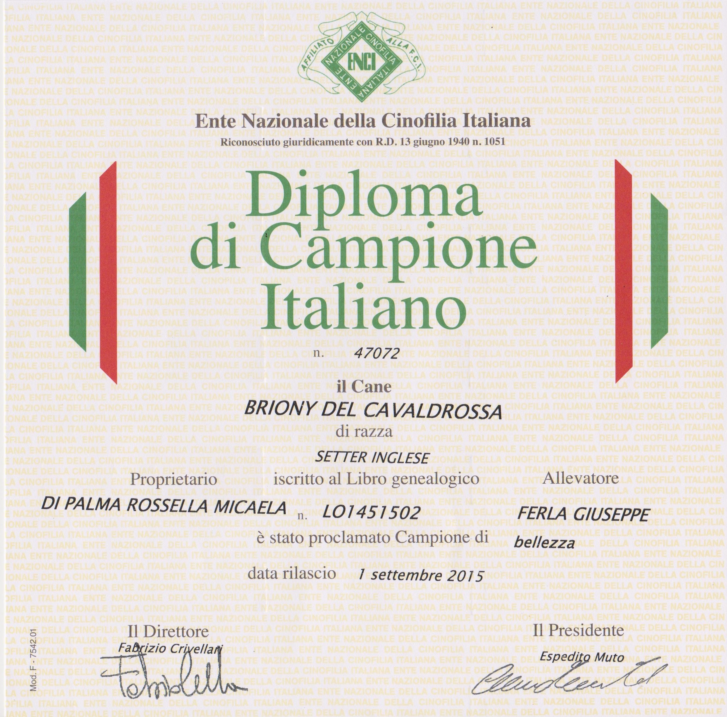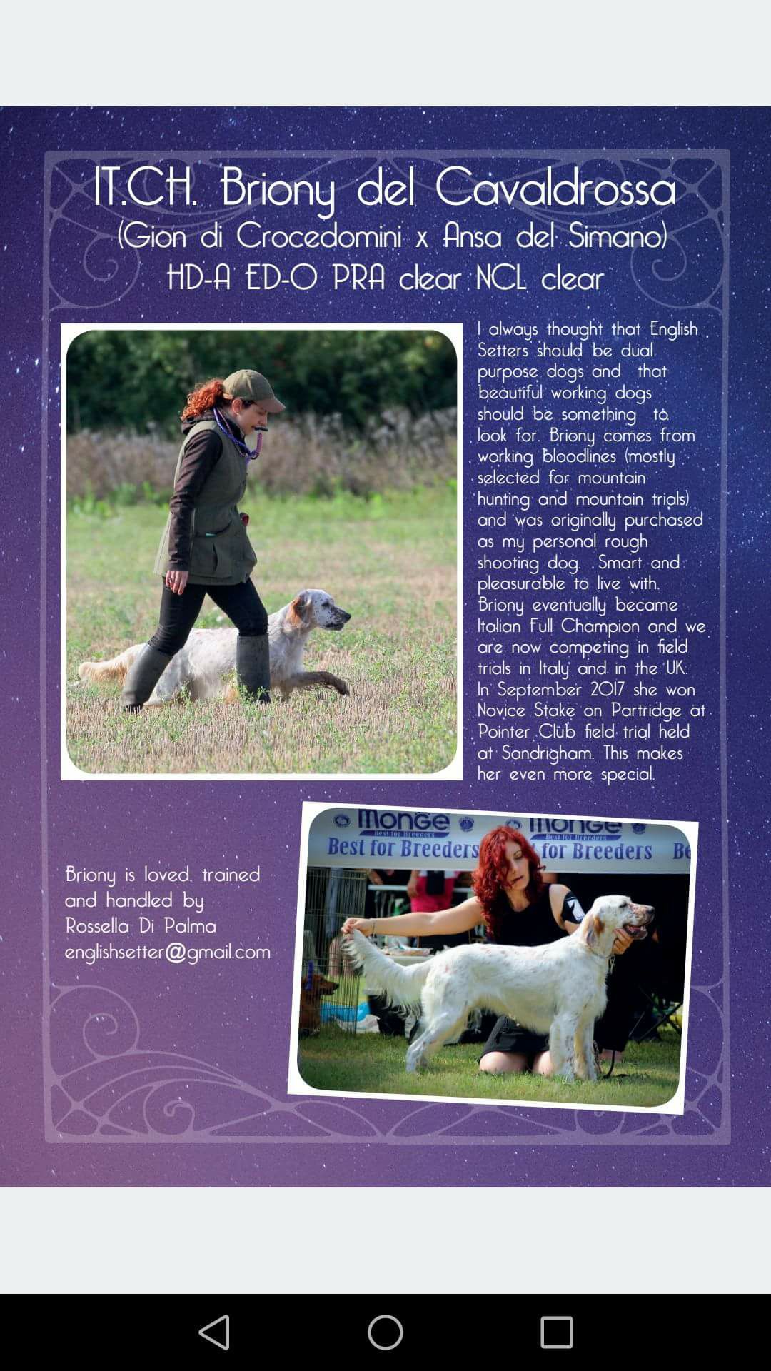 Briony è stata acquistata come cane da caccia ad uso personale. Successivamente, pur provenendo da linee di sangue esclusivamente da lavoro, è diventata Campionessa Italiana di Bellezza. È alta 58 cm e ha una dentatura corretta e completa (certificata). È Riproduttore Selezionato ENCI. Morfologicamente è un soggetto tipico che ha conseguito anche 2 BOB (Migliore di Razza) e 3 BOS (Best of Opposite Sex).